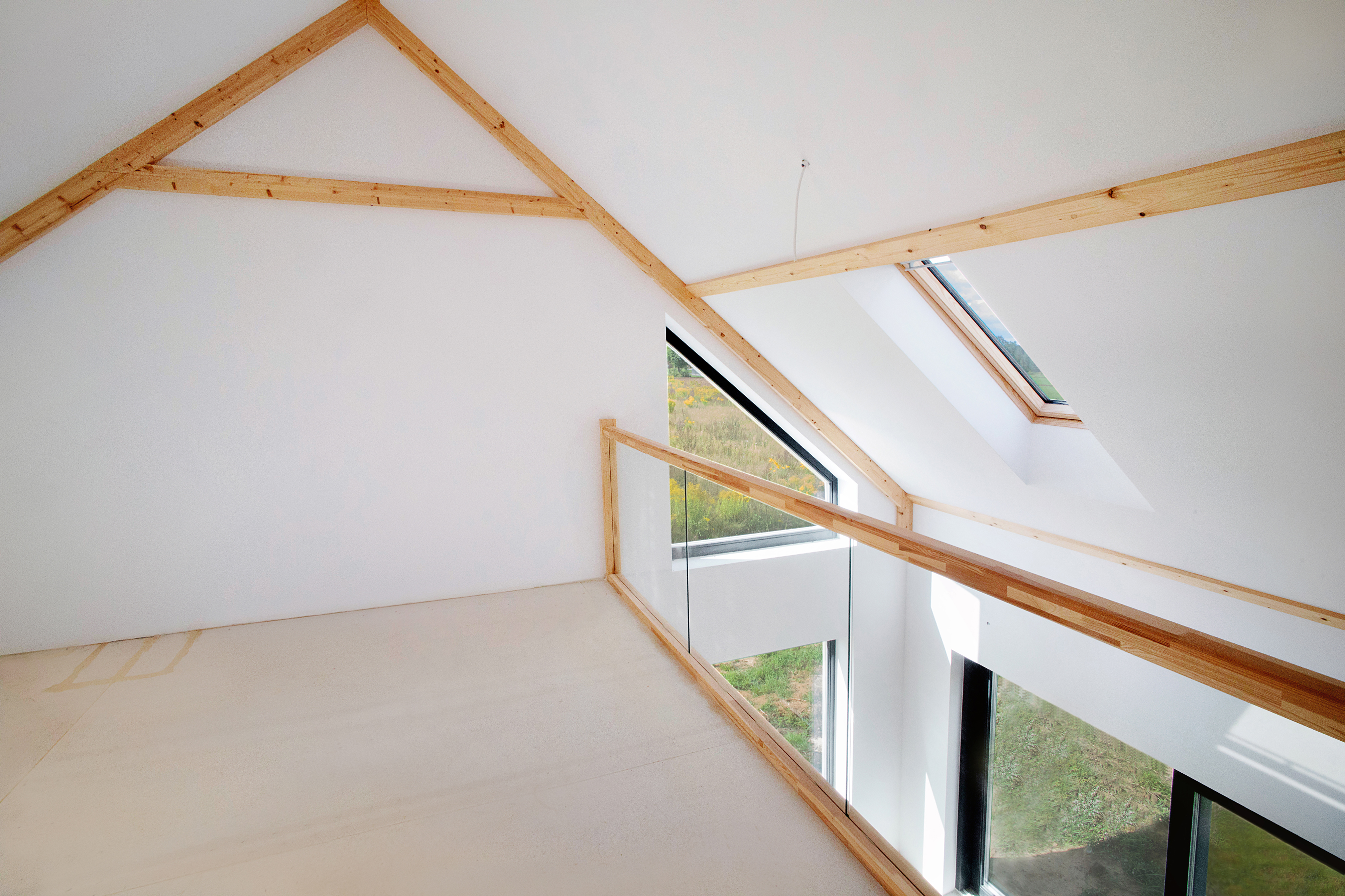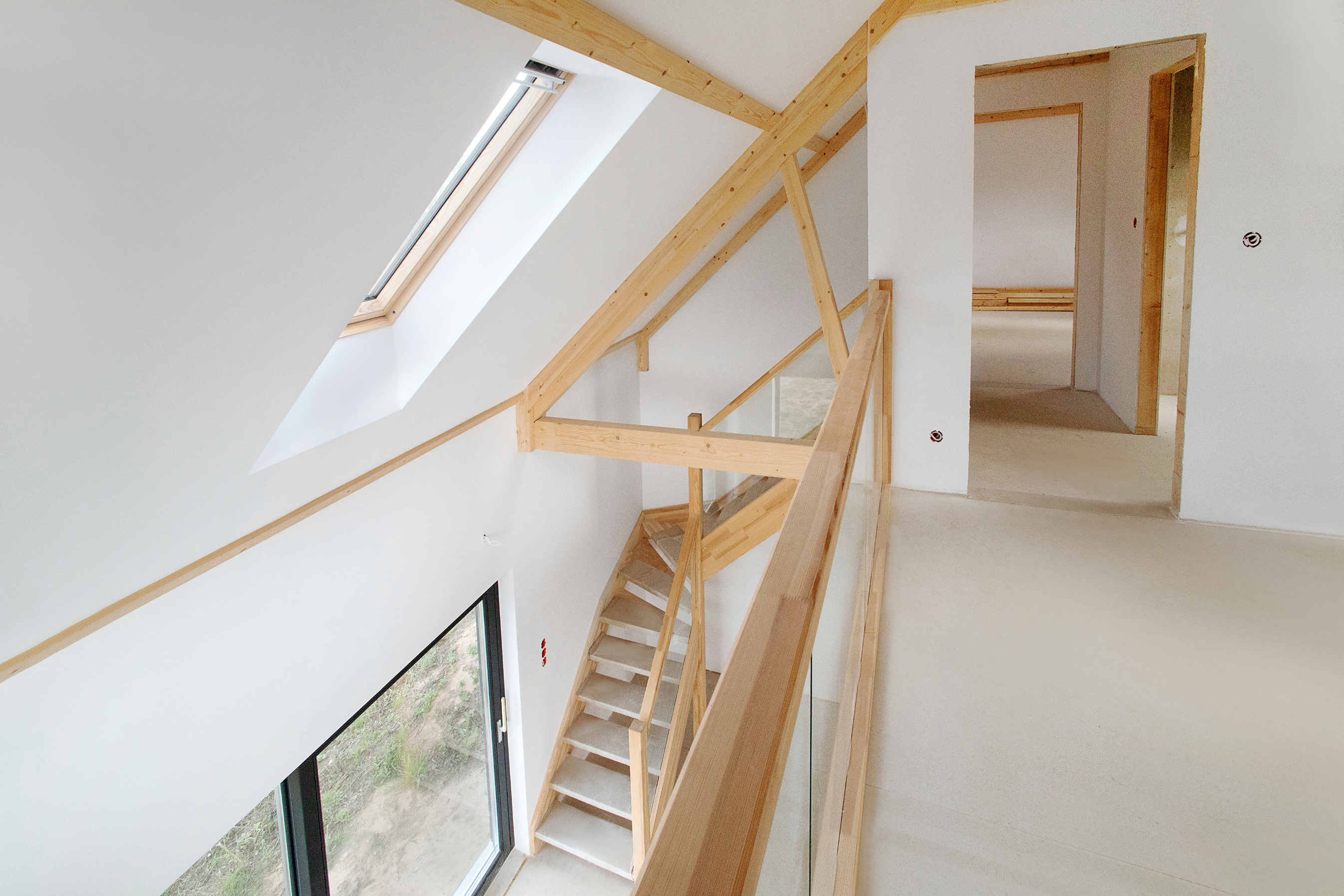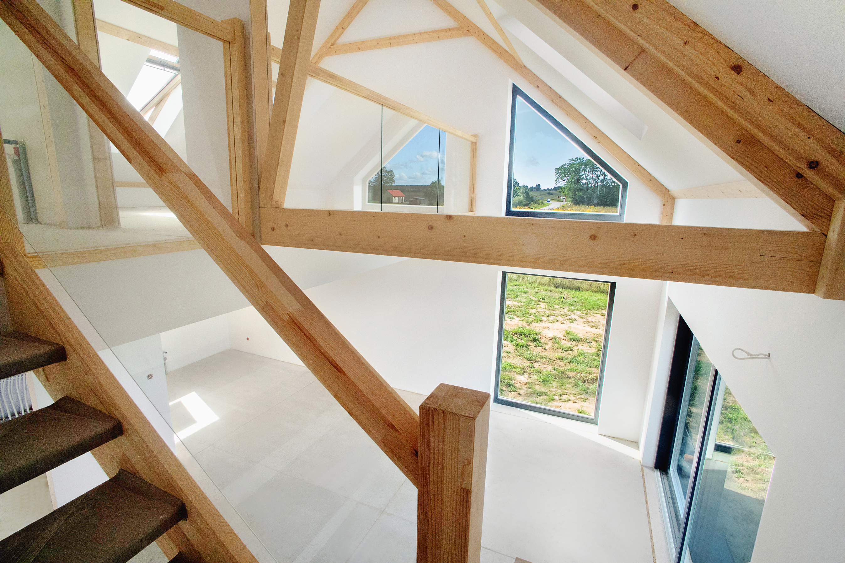 stolarka drewniana trzyszybowa, okna połaciowe VELUX, dodatkowe szklenie w ścianie szczytowej poddasza