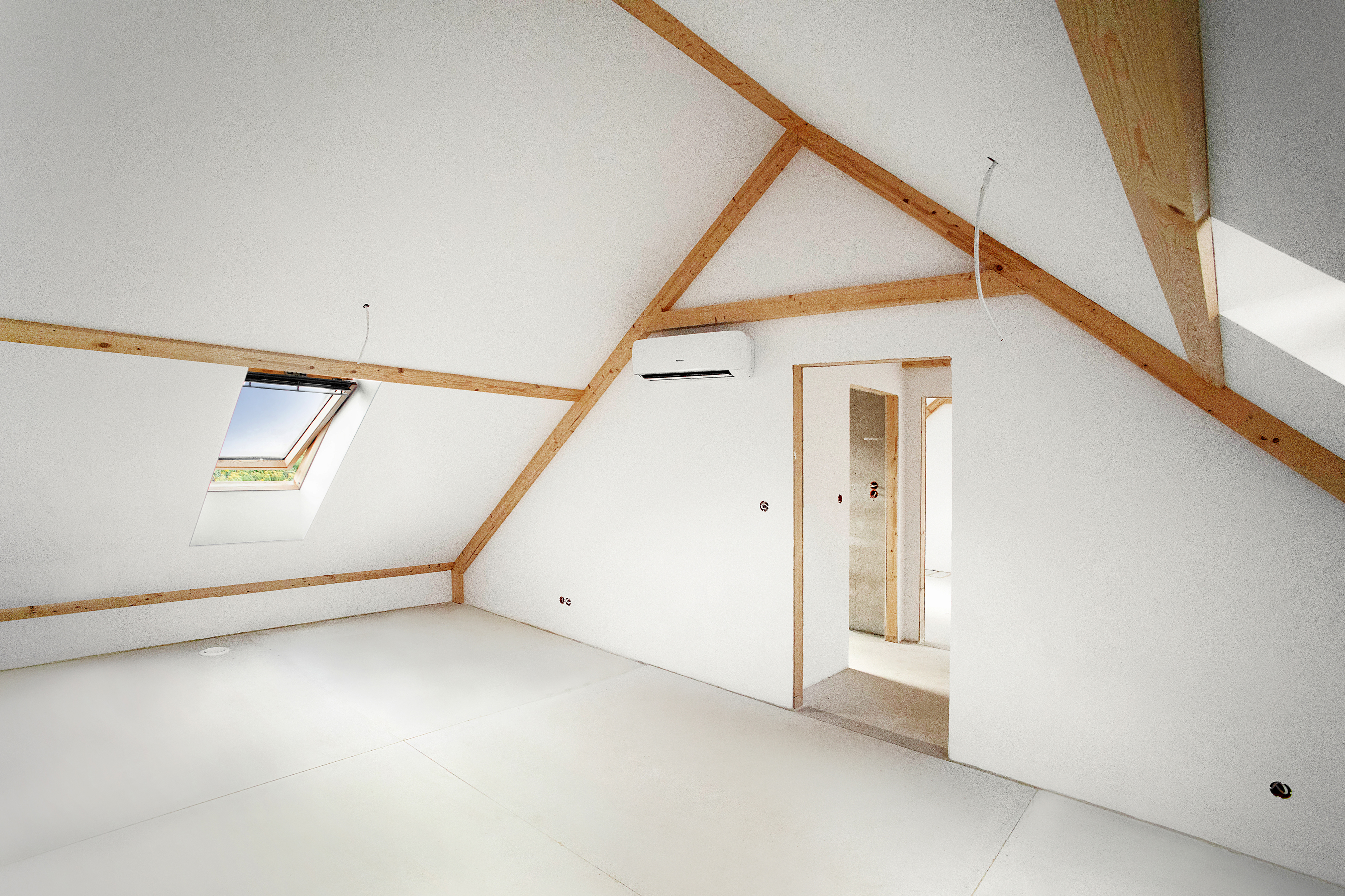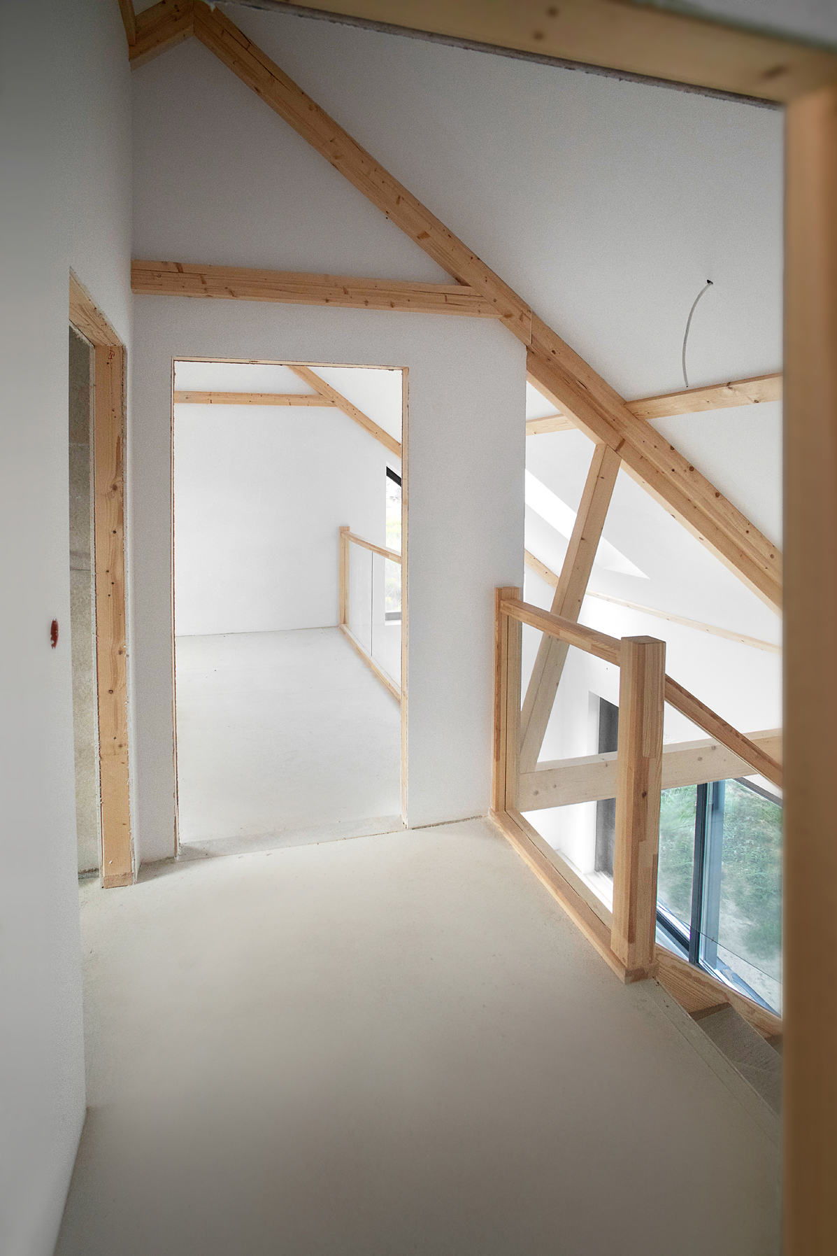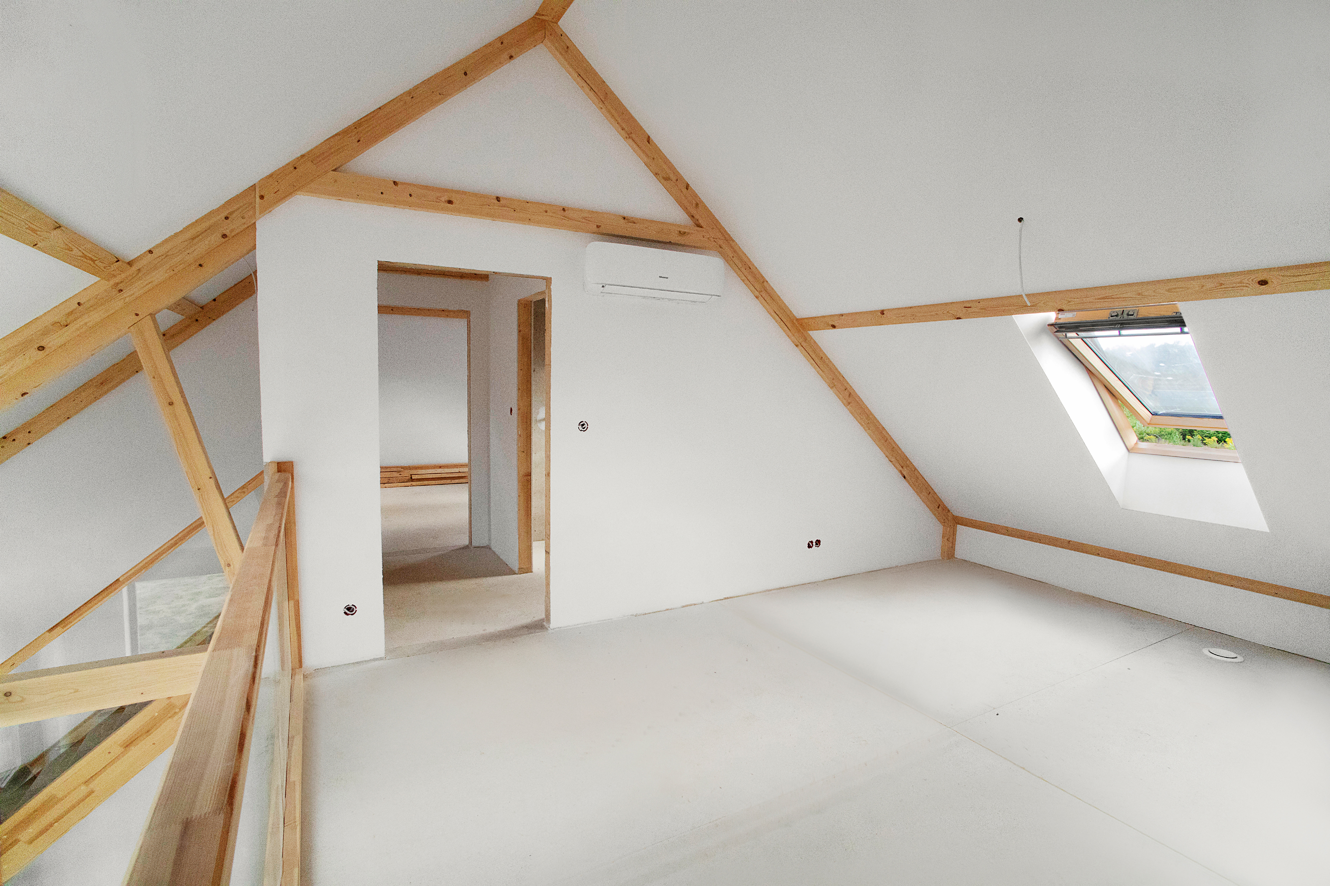 stolarka drewniana trzyszybowa, okna połaciowe VELUX, dodatkowe szklenie w ścianie szczytowej poddasza