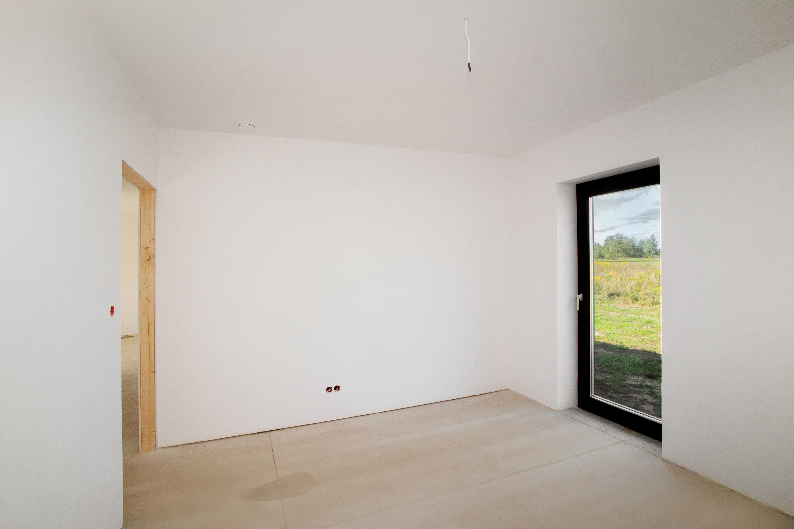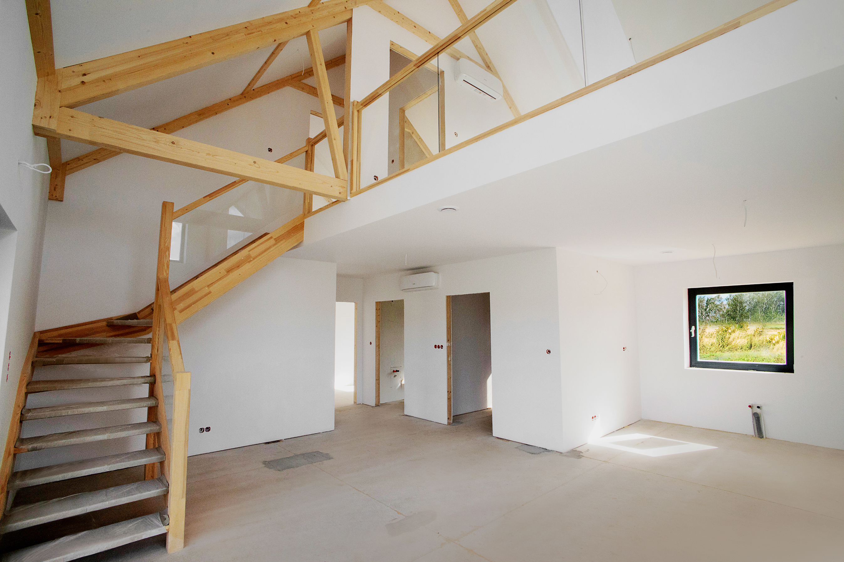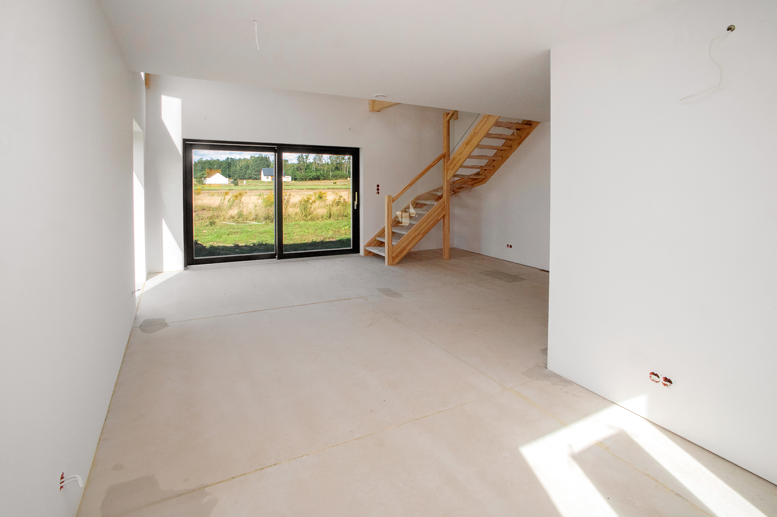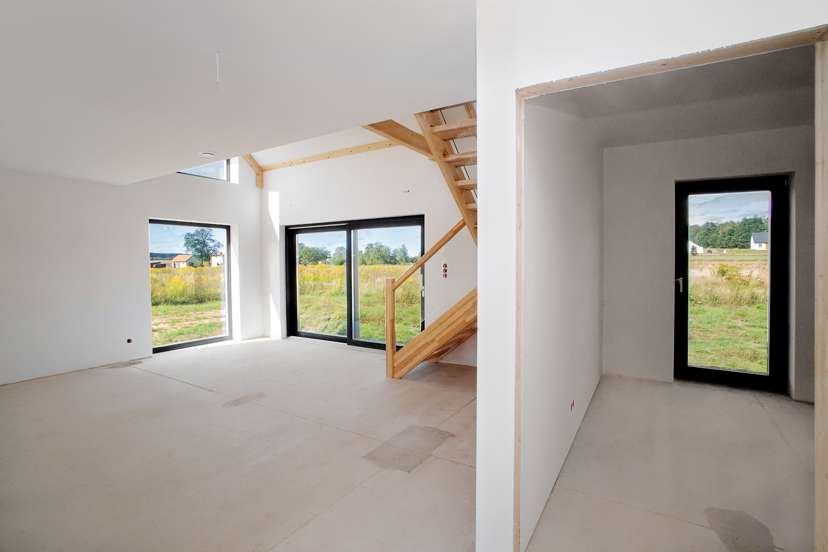 antresola z balustradą z drewna i szkła bezpiecznego, schody drewniane z balustradą z drewna i szkła bezpiecznego, płyta fundamentowa, stelaże sanitarne podtynkowe GROHE, 2 szt., instalacja fotowoltaiczna 5,8-6,4 kWp, Miejsce parkingowe, Ogród